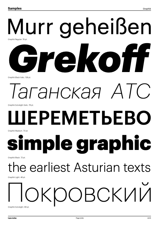 Graphik was inspired by the appealing plainness seen in many of the less common 20th century European sans serifs and in the hand-lettering of classic Swiss Modern posters. First drawn as the house style for Schwartzco Inc., it was further developed for Condé Nast Portfolio and later for Wallpaper* and T, the New York Times Style Magazine. It is suitable for display purposes as well as for text sizes, captions and for such specific tasks as navigation systems and map-making.