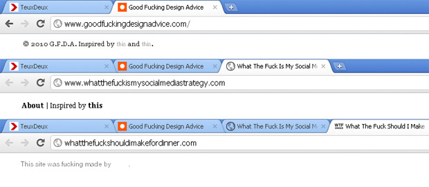 A while back, I had stumbled upon Good Fucking Design Advice which, well, gave good fucking design advice and then some. I happened to visit the site again to download another wallpaper and I noticed this small line at the bottom after the Copyright stuff which said, “Inspired by this and this.” Curiosity may have killed the cat, but it didn’t bother me. I went ahead and clicked on ‘this’. And the other ‘this’ too. The first one led me to a website called ‘What The Fuck Is My Social Media Strategy‘, made by two other guys which takes a dig at corporate jargon about Social Media Strategy (duh?). I enjoyed the dig and I noticed something at the bottom. Guess what? A line that says, “Inspired by this.” I clicked on that too. I mean ‘this’. Meanwhile, the second this from the first website called for my attention. I checked it. I landed up on ‘What The Fuck Should I Make For Dinner‘. This site shouts out random dinner suggestions which you can keep on rejecting if you like (don’t try it with your wife, though). Remember the first ‘this’ on the second website. Yes! That one led me to this same dinner website. I couldn’t help it. I checked the bottom of the site. There was a ‘this’. But it was not a clue. It was a part of a sentence that said, “This site was fucking made by Zach”. “To hell with the cat”, I said and clicked on Zach and it led me to a website of Zach Golden, a copywriter in NYC, who, by the way, didn’t have ‘Fucking’ anywhere on the site. So, all in all, a nice fucking search from one fucking interesting website led me to another and then another and then yet another one which further led me to one fucking cool guy who fucking started it all. Fucking copying, you might say. Well, I think it is fucking inspiring. Maybe, I will start a fucking website. Be sure to check the bottom that will say, “Inspired by this, this and this. Or maybe that. Whatever. If you are still fucking reading this, don’t! Go and surf these fucking awesome sites instead. Thank you fucking Zach for starting it all.